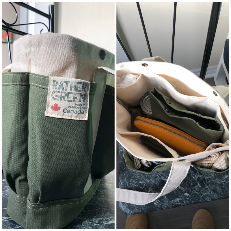 Enjoying my Rather Green bag, made in Peterborough, ON. It’s big enough to hold everything and with all the pockets, you can also find what you need without having to root around or take things out. Thé removable pouch holds stuff for communal religious worship. It doesn’t need to be in the bag all the time, but on the appropriate day, I can pop it in to be ready quickly & without forgetting anything.