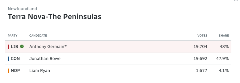 An example of why "every vote matters". The liberals won in Terra Nova-The Penisulas by 12 votes!